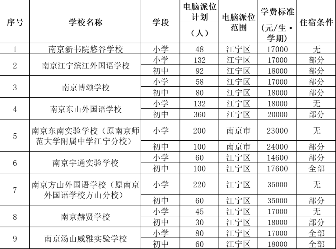 南京市江宁区2024年民办义务教悔学校电脑派位规划表