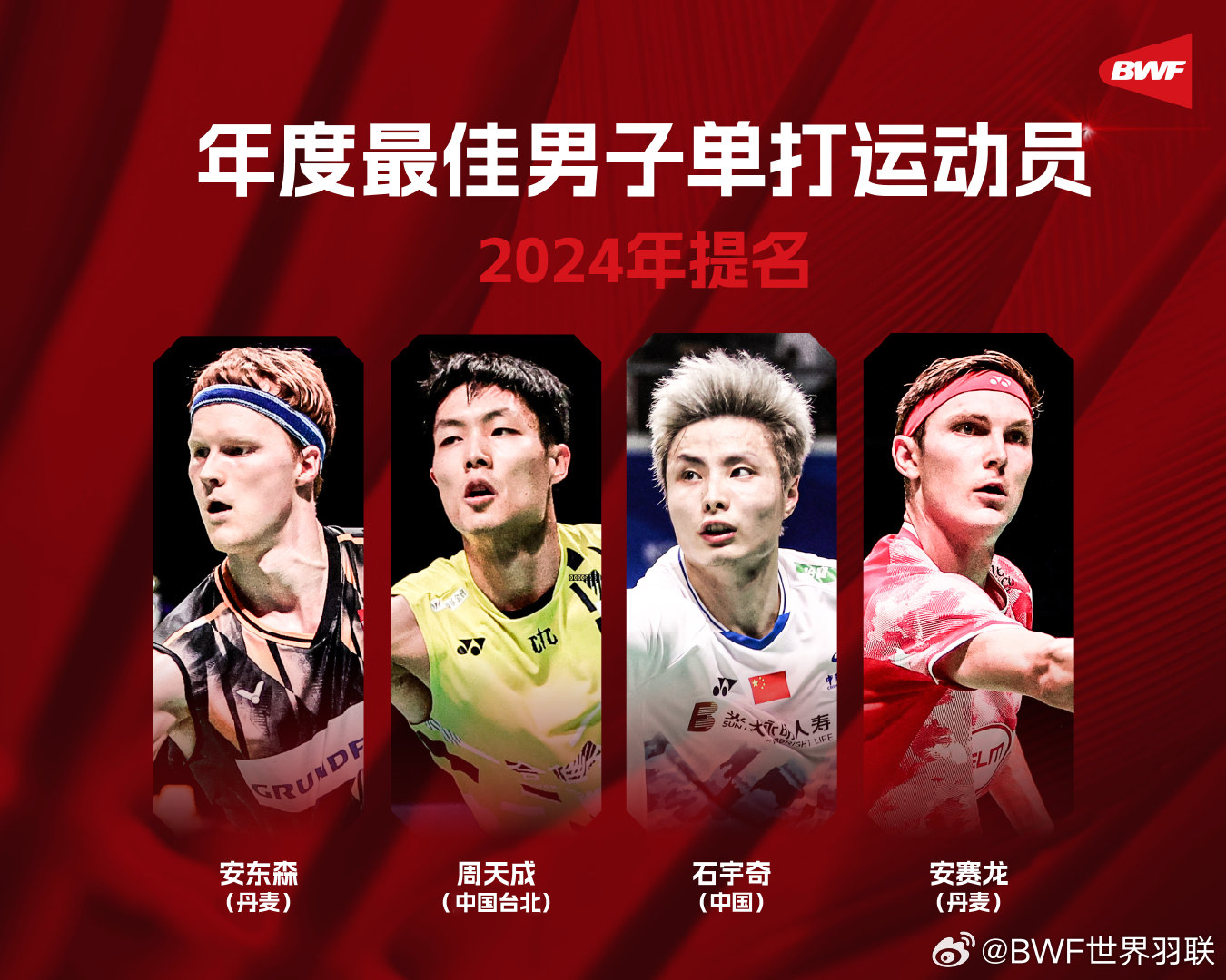 年度最好男人单打畅通员:安东森(丹麦)、周天成(中国台北)、石宇奇(中国)、安赛龙(丹麦)