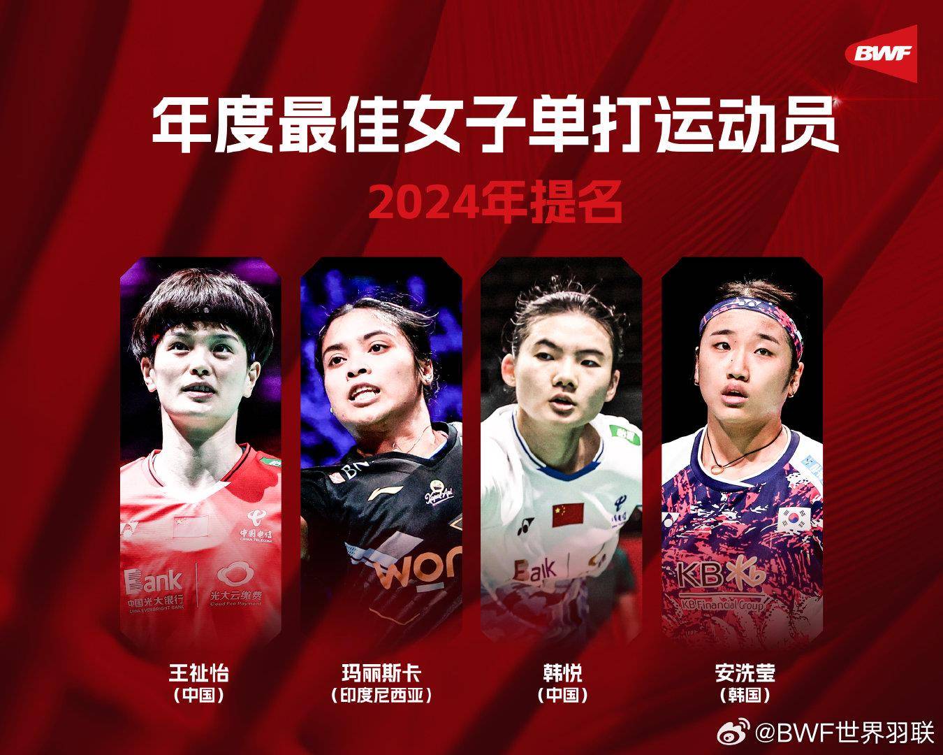 年度最好女子单打畅通员:王祉怡(中国)、玛丽斯卡(印度尼西亚)、韩悦(中国)、安洗莹(韩国)