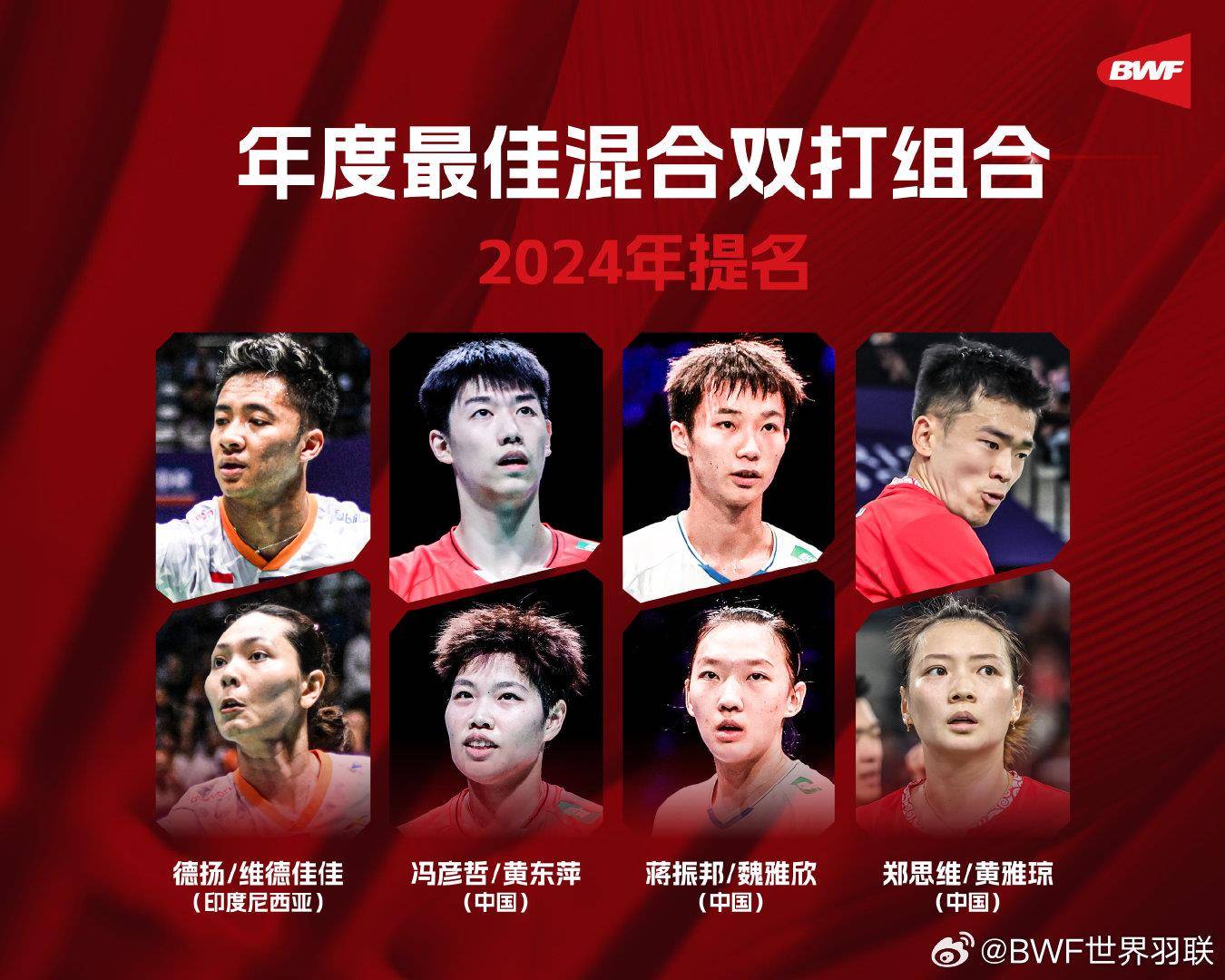 年度最好混杂双打组合:德扬/维德佳佳(印度尼西亚)、冯彦哲/黄东萍(中国)、蒋振邦/魏雅欣(中国)、郑想维/黄雅琼(中国)