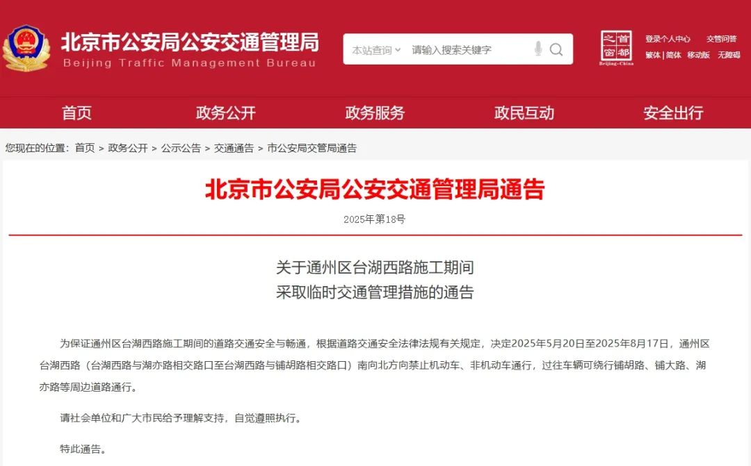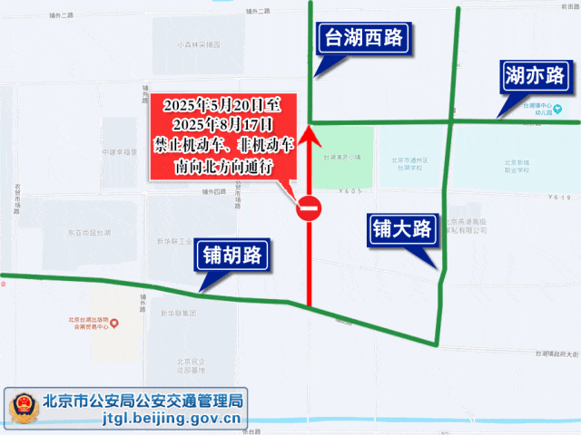 为保证通州区台湖西路施工时辰说念路交通安全与畅达,阐发说念路交通安全法律限定关连章程,决定2025年5月20日至2025年8月17日,通州区台湖西路(台湖西路与湖亦路相交路口至台湖西路与铺胡路相交路口)南向朔标的谢却生动车、非生动车通行,过往车辆可绕行铺胡路、铺通衢、湖亦路等驾驭说念路通行。